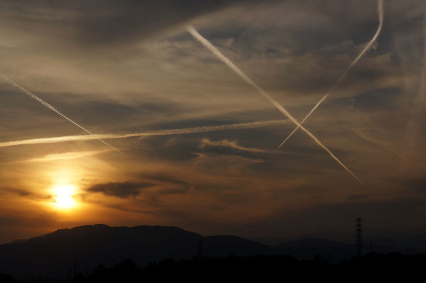 自宅の庭から。縦方向の航跡は旅客機、横切っているのは?