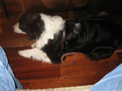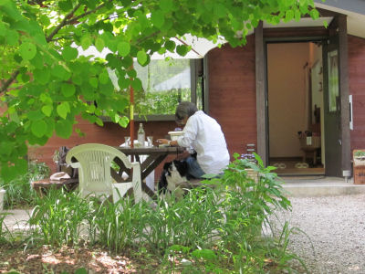 夕食の間足元でおとなしく待つ。右は昼食を取ったCAFEこもれび。テラス席でもペット連れを拒否したのはおいしい学校。