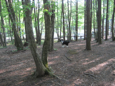 宿泊したロッジと林の中のドッグラン。
