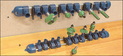ルータービットだけではなく、ハンマーや手鋸など道具を並べて置く際、等間隔ではスペースの無駄、かといって今の手持ちに合わせるとのちのち工具が変わったときに納まりが付かなくなる・・・でこんなシステムがいいですね。どこと無くカーテンレールに似てますねぇ(笑)