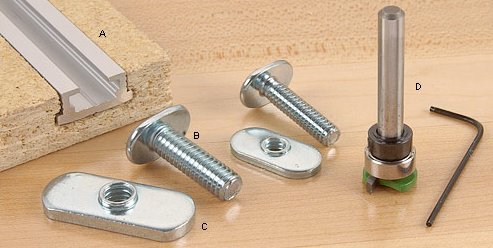 単純なコの字型Tスロットでは金具を木ネジで固定するので、クランプする位置によっては浮き上がってしまうことがあります。このタイプははかま?付でその心配が少なそうです。ガイド・ペアリング付の専用ビットでテーブル、フェンスなどの加工も楽に出来そうです。