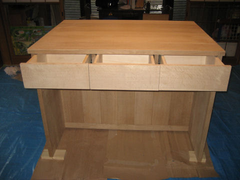荒材はねじれがあり、幅も150mmの手押しかんなは使えないので、ジグを作成して自動かんなで平面出しをした。虫食いで切り落としする無駄が出てしまい、その上天板の高さをシステムキッチンと同じ850高にしたいという変更があったりして予備板だけでは足りなくなってしまった。ところが間が悪いことに台風の直撃でその材木屋の倉庫の屋根が飛ばされてしまい、1月ほど待っても埒が明かない。仕方が無いので見えない部分は板目板を使うことにして通販で購入、ネットで専門店として販売しているようだがいまいちだった。